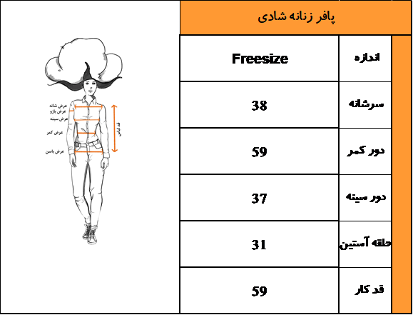 پافر زنانه دارای دوخت تزئینی روی لباس و دوجیب در غل میباشد و به وسیله زیپ و دکمه بسته میشود. برای مراقبت بیشتر توصیه میشود با دست شسته شده و روی سطح پهن شوند تا کار دچار تغییر شکل نشود.